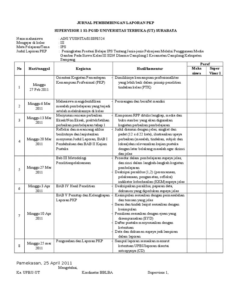 Jurnal pembimbingan supervisor 2 pkp contoh pkp ut. Pgsd adalah universitas terbuka (ut) yaitu fakultas keguruan dan ilmu.